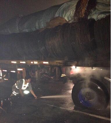 5月10号,天河区城管局环卫三所的洒水车正在奥体黄村立交上桥位附近加水,正巧一辆装了几十吨钢筋的挂车途经这里,突然间,大货车靠近油箱部位的两个轮胎不明原因冒起了黑烟,车底迅速地冒起了火苗燃烧了起来,随时都有爆炸的可能。“不好,起火了!”正在加水的环卫工人张伟金、杨天福、杨中华听到了货车司机呼救声,来不及思考马上放下手头工作立即去帮忙灭火。由于现场一时找不到灭火器,环卫工人们就利用洒水车水枪灭火,用水嘴对火源处持续喷水,虽然热浪扑面,他们仍奋不顾身,经过将近半个小时的冲水,大火终于被控制。货车司机不停地向张伟金等人表示感谢。