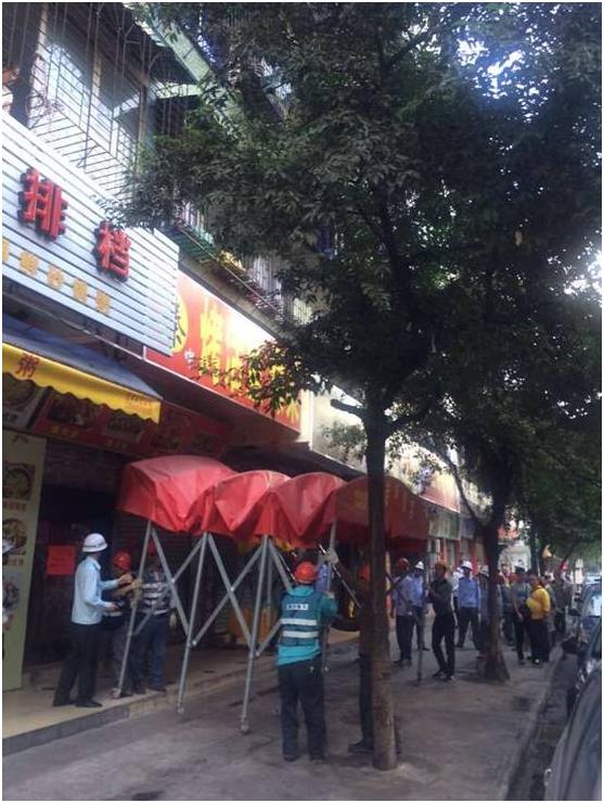 凤华路、花城北路两侧沿街都是大排档,大多数的店铺为了扩大自己的经营面积纷纷在人行道搭建落地雨篷进行占道经营,一到傍晚时分,本来就不宽的路面被完全“侵占”,人车混杂,行人都难以通行。对于此乱象,新华街城管中队曾多次对违章店铺下达《责令限期拆除通知书》要求经营者进行自拆,可部分仍是屡次不改。17日上午,根据(花办发〔2015〕15 号)关于建设“干净、整洁、平安、有序”城市环境工作的精神,新华街城管中队在城管分局、街道办的组织协调下,会同城西派出所、直属一中、市政环卫所、街道相关科室等多个部门的执法力量60多人,对新华街道路两侧和公共场所未经批准擅自搭设的落地式雨篷进行专项清拆。经过两个多小时的清拆行动,花城北路一带的19个的落地雨篷被集中拆除了,拆除的总面积约800㎡。三名拒不改正、阻碍执法人员执行公务的三名大排档经营者还被派出所带离现场做进一步的处理。经过综合整治,花城北路一带的道路变得宽敞了,逐步恢复了原来的干净、整洁面貌。