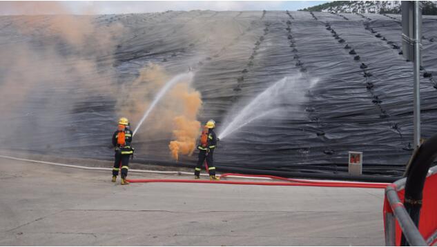演练模拟棠厦填埋场垃圾堆体自燃引起火灾事故,中间涉及通讯联络、交通管制、紧急疏散、火灾扑救、医疗救护、后勤保障等环节。演练人员紧张有序地演练了初起火扑救、信号弹燃放、消防车进场灭火等项目。