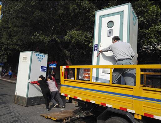 环卫工人搬运流动厕所