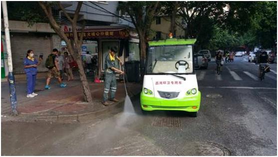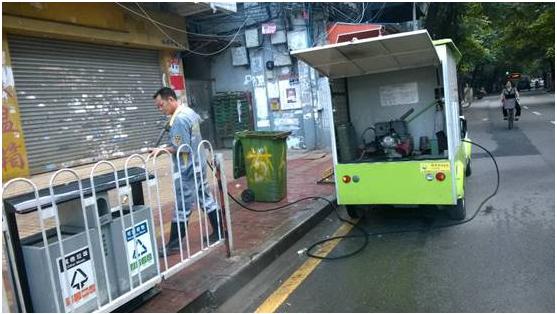荔湾区城市保洁管理所环卫工人在清洗中山八路