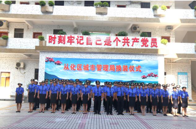 广州市城管委在9月30日举行的执法队员换装仪式上正式宣布,自2017年10月1日零时起,全市正式在编在岗的3500名城管执法队员,要统一更换执法服装,着新式夏季制式服装。10月9日,区城管局举行换装仪式,从即日起,全区在编在岗的城管执法人员统一换上蓝色制服,以全新的面貌迎接工作。区城管局主要负责人,80多名城管执法人员代表参加了仪式。
